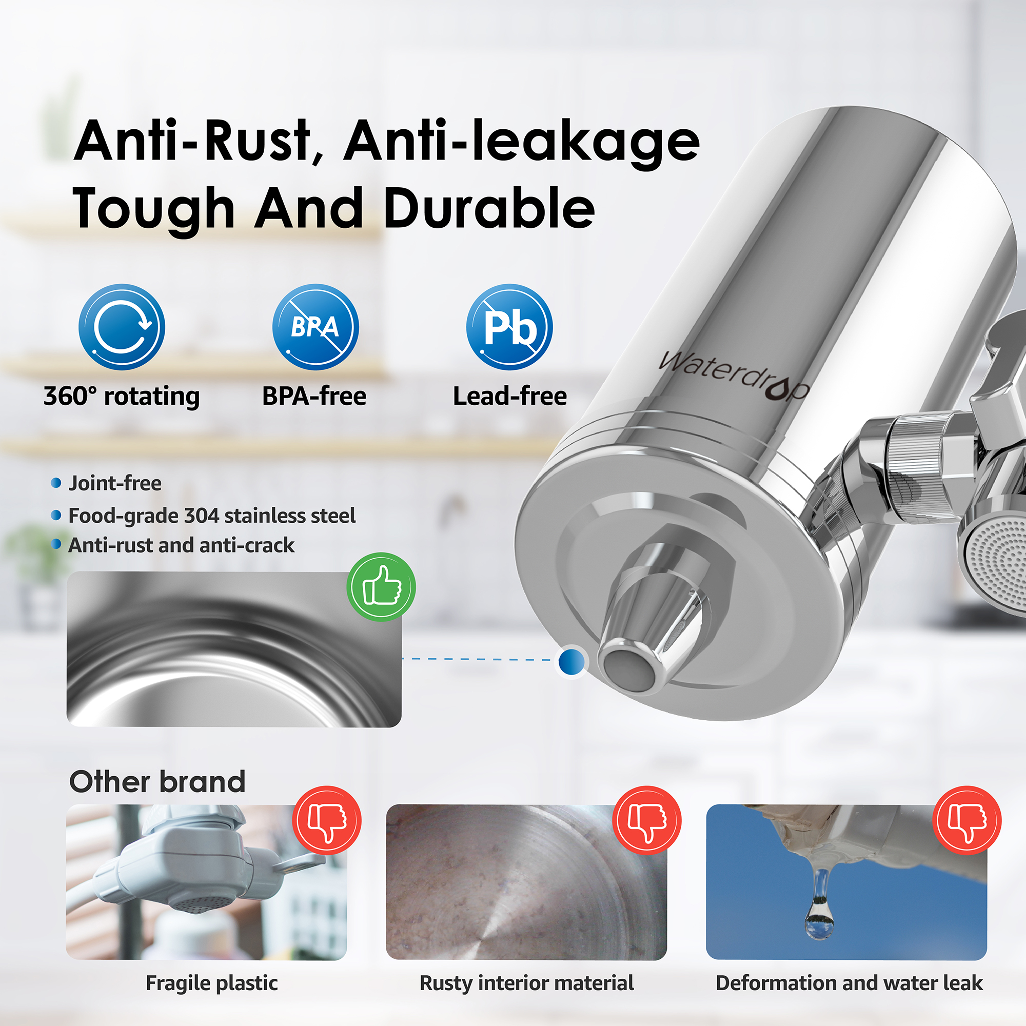 Chất liệu vòi lọc: Inox 304 sử dụng trong thực phẩm (Vòi có chức năng xoay 360 độ)