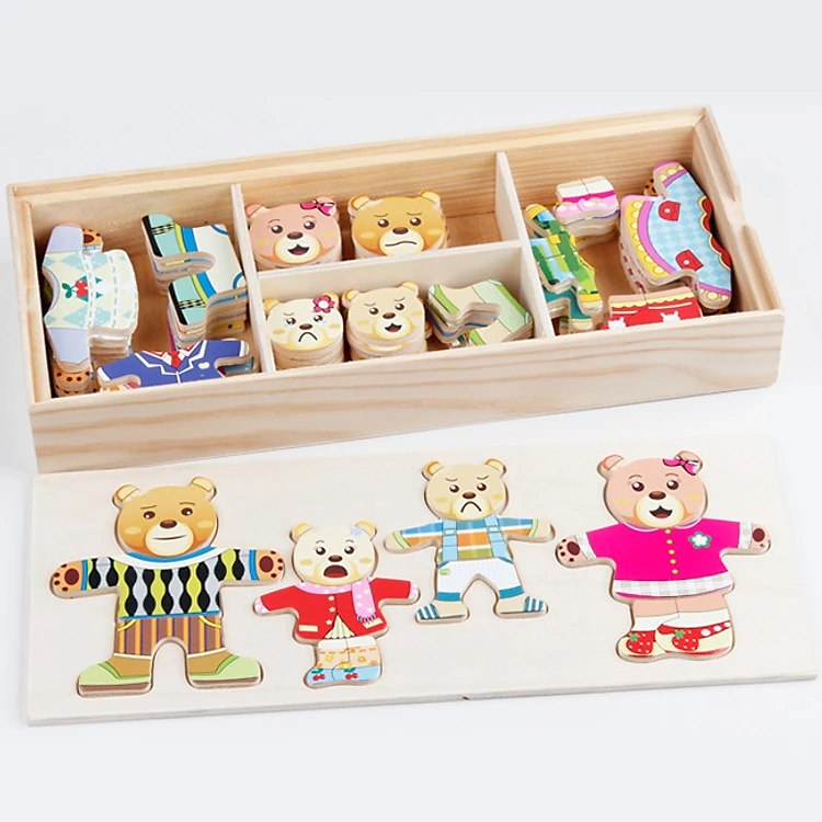 - Nhiệm vụ của bé là thay đổi trang phục cho gấu bằng cách chọn miếng ghép phù hợp và vừa vặn với khuôn tạc trên thanh gỗ nhất đồng bé thay đổi cảm xúc khuôn mặt của các " người mẫu "gấu.