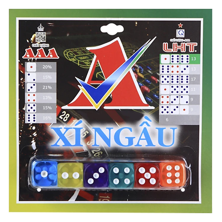 - Bộ Xí Ngầu Vỉ Màu LHT UXNVM là vật dụng không thể thiếu trong các trò chơi như lắc xí ngầu, cờ cá ngựa, cờ tỷ phú. Bộ xí ngầu đáp ứng được nhiều mục đích khác nhau. Bạn có thể ngẫu hứng tạo ra bất kì trò chơi tính điểm nào với 1 viên xí ngầu.