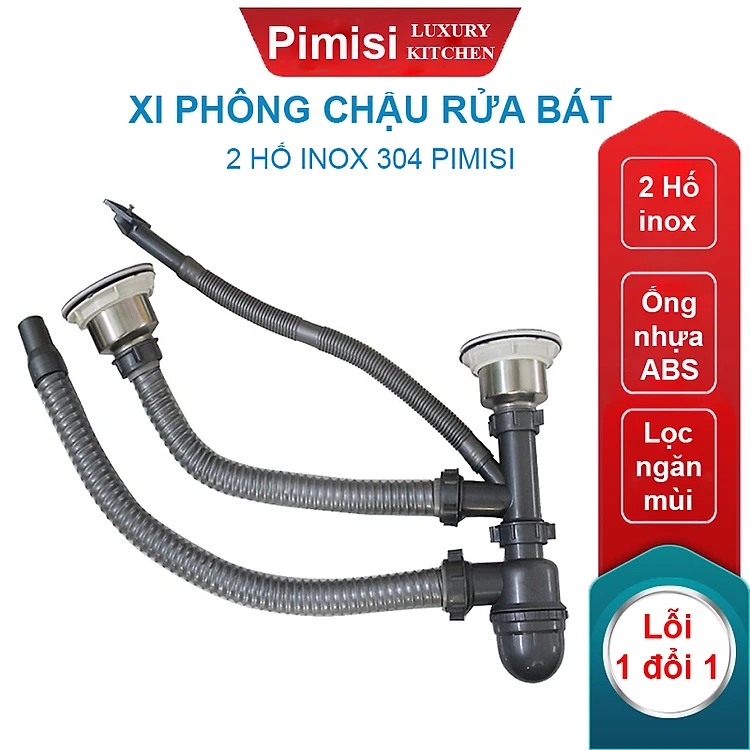 Bộ xi phông chậu rửa bát 2 hố phi 110 inox 304 Pimisi dùng để xả nước chậu rửa chén 2 hộc - có đầu thoát tràn | Hàng chính hãng
