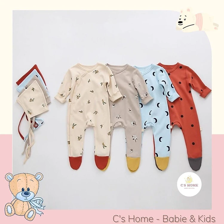 Bodysuits cotton dài tay kèm mũ cho bé sơ sinh từ 0 đến 24 tháng, style Hàn Quốc