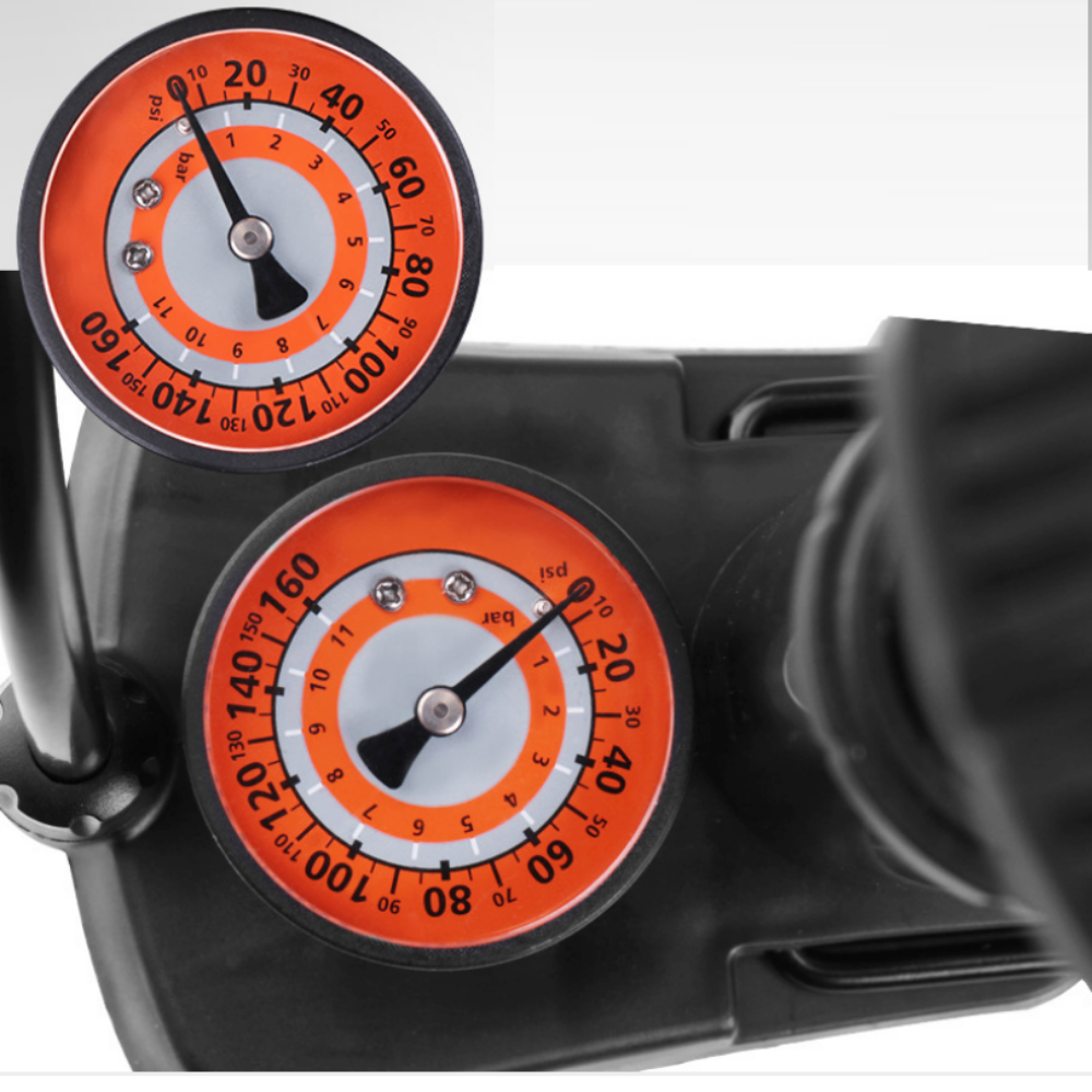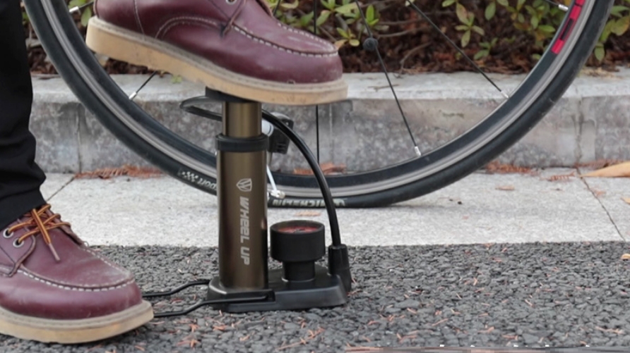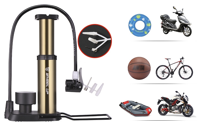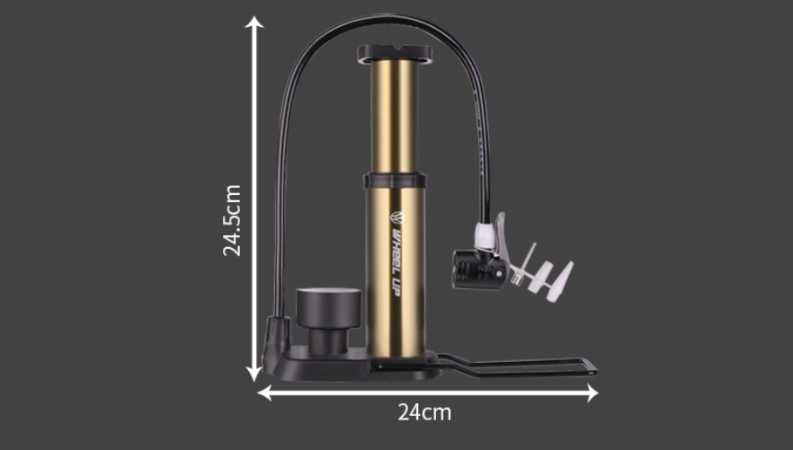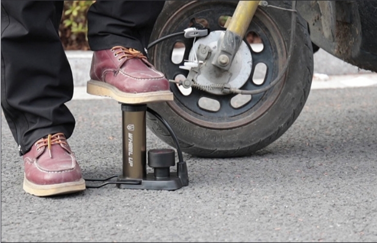 Bơm đạp chân cho xe máy, xe đạp, xe phân khối lớn Wheel Up, hỗ trợ cả van Mỹ và van Pháp. Có đồng hồ đo áp suất