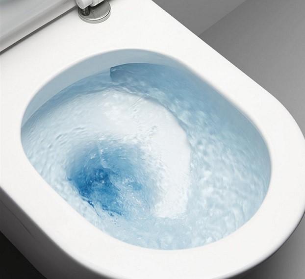 - Không giống phương pháp xả thông thường, Công nghệ xả xoáy và xả của RHENWARE giúp dòng nước chảy xuống từ thành cầu có sức phun mạnh trực tiếp và xoáy đều quanh mặt bồn cầu giúp cọ rửa sạch mà không gây tiếng ồn