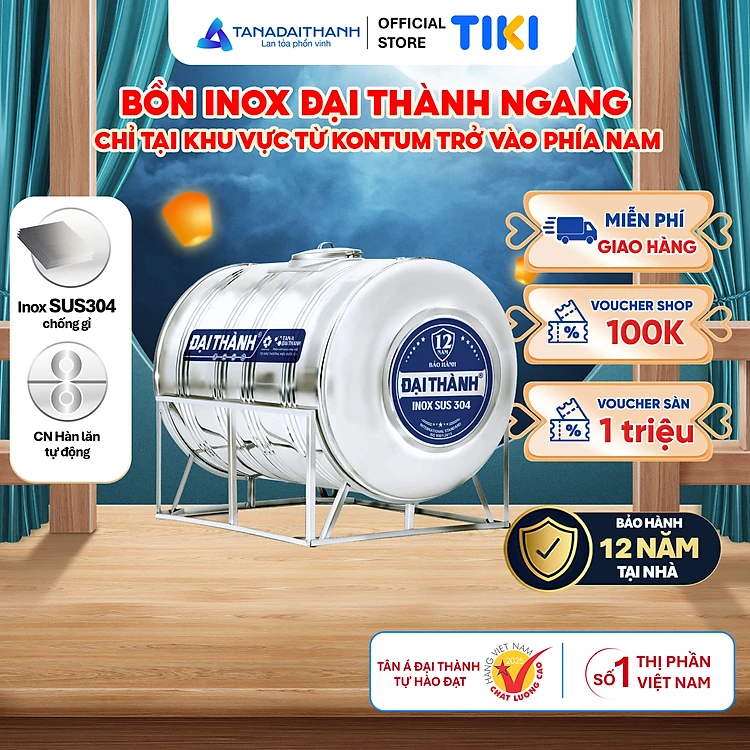 Bồn nước inox Đại Thành Ngang (500L, 1000L, 1500L, 2000L) - SUS 304, Hàng chính hãng (Chỉ bán tại khu vực miền Nam)
