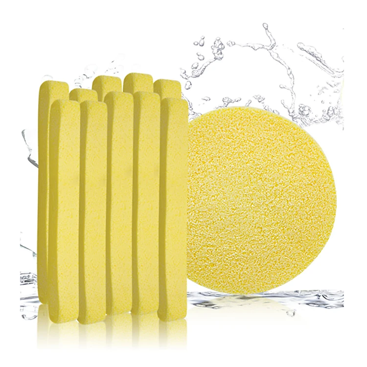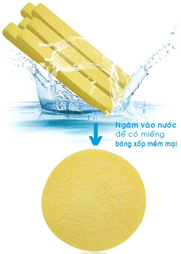 Bông được nén thành 1 thanh dài, khi cho vào nước sẽ nở ra thành miếng bông xốp mềm mại.