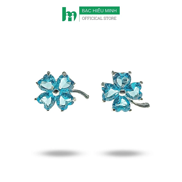 Bông Tai Khuyên Tai Bạc 925 Hình Cỏ 4 Lá Đính Đá Xanh Dương BẠC HIỂU MINH HT363