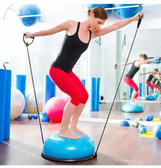 Cách tập : đặt lật ngửa trái bóng bosu lên sàn và thực hiện động tác đứng hơi khùng chân và tay dang về phía trước.thực hiện bài tập này khoảng 4 hiệp,mỗi hiệp 10 – 15 reps,nghỉ giữa hiệp 2 – 3 phút .Nâng cao của bài tập này là động tác đứng lên ngồi xuống như bài squats vậy