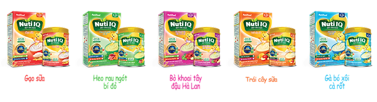Bột ăn dặm Nuti IQ có nhiều lựa chọn đa dạng, kết hợp những nguyên liệu được chọn lọc công phu, tinh tế, giúp bé ngon miệng và đổi khẩu vị mỗi ngày.