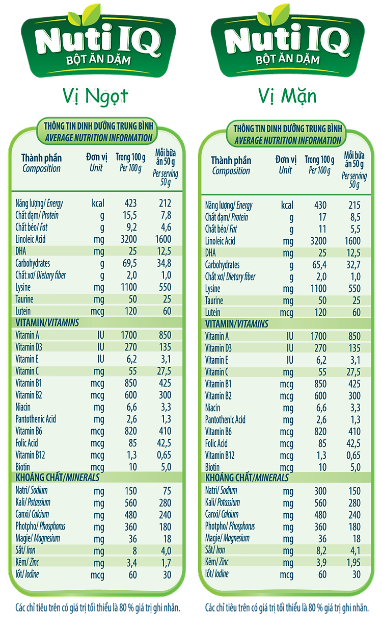 Bằng công thức dinh dưỡng đặc biệt, được tư vấn bởi Trung tâm dinh dưỡng thành phố Hồ Chí Minh, dành riêng cho bé từ 6-24 tháng tuổi, Bột ăn dặm Nuti IQ đem đến cho bé những bữa ăn đầu đời đầy đủ dưỡng chất.