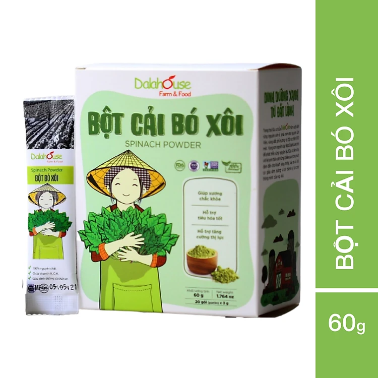 Bột bó xôi DalaHouse sản xuất từ 100% bó xôi tươi được trồng và thu hoạch tại trang trại organic của Dalahouse tại Đơn Dương, Lâm Đồng. Chúng tôi sử dụng công nghệ sấy lạnh hiện đại tiêu chuẩn Châu Âu và công nghệ nghiền thực phẩm ở nhiệt độ thấp giúp bảo toàn các enzym và chất dinh dưỡng của rau củ, đảm bảo uy tín về chất lượng cũng như nguồn gốc với quy trình khép kín đạt chứng nhận FDA.
