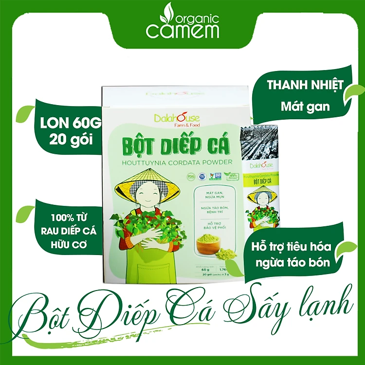 Bột Diếp Cá hữu cơ nguyên chất sấy lạnh Dalahouse - Hộp 20 gói nhỏ 3gr định lượng sẵn cho 1 lần sử dụng - Mát Gan, ngừa mụn, ngừa trĩ và táo bón. Hỗ trợ bảo vệ Phổi