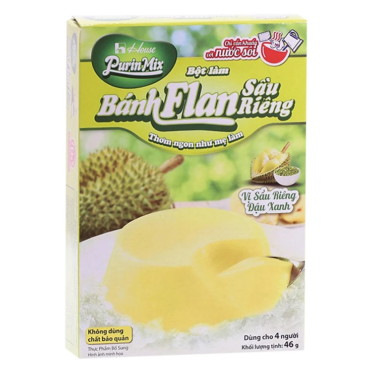- Bột Làm Bánh Flan Sầu Riêng - Purinmix Vị Sầu Riêng Đậu Xanh (46g) là loại bột tiện lợi giúp bạn dễ dàng tạo ra những chiếc bánh flan thơm ngon và bổ dưỡng mang hương vị vô cùng độc đáo và hấp dẫn.