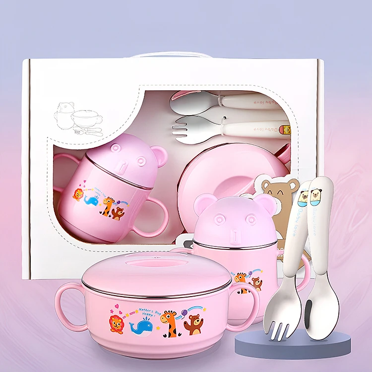 BPA Free Baby Feeding Set Children Dinnerware Set 304 Stainless Steel Feeding Bowl with Lid Milk Cup Spoon and Fork for