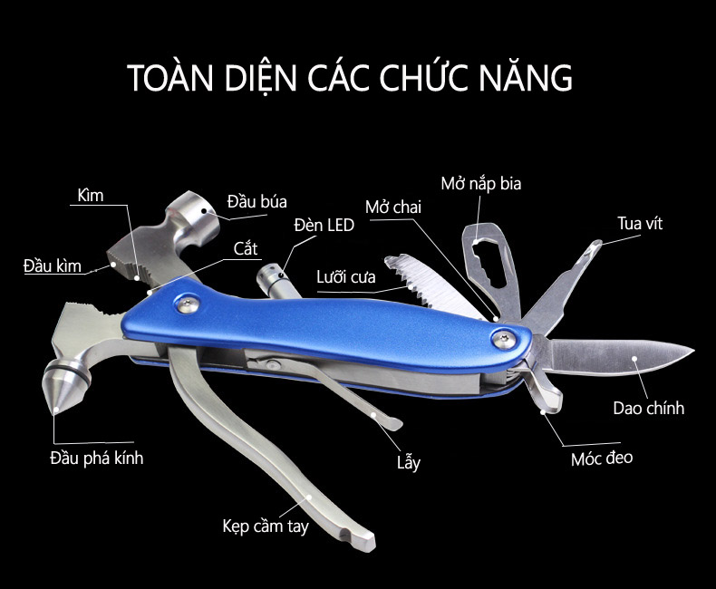 Nhìn sản phẩm nhỏ bé này, bạn sẽ nghĩ đây đơn thuần chỉ là một chiếc búa thôi đúng không? Nhưng không chỉ có như vậy đâu. Đây là một bộ sản phẩm sửa chữa đa năng gồm rất nhiều vật dụng như: búa, kìm,cưa nhỏ, dao, tuốc nơ víđược thiết kế vô cùng độc đáo trong cùng 1 sản phẩm. Chỉ cần mở chiếc búa ra, bạn sẽ cực kì bất ngờ bởi sự thông minh và tinh tế của người thiết kế ra nó. Đó chính là lý do bạn nên chọn bộ sản phẩm này cho mỗi cuộc hành trình của mình, vừa nhẹ, vừa tiết kiệm không gian lại cực kì hữu ích. Hoặc, việc sử dụng bộ búa kìm đa năng này trong nhà hàng ngày sẽ giúp bạn sửa chữa kịp thời những đồ gia dụng mà không còn phải dùng đến những bộ đồ chuyên dụng hay nhờ thợ sửa nữa. Đa chức năng: Búa đa năng 8 trong 1 tuy có kích thước nhỏ gọn nhưng tích hợp đến 8 công dụng tiện ích bao gồm: đầu búa dùng để đóng hoặc nạy đinh ốc, kiềm, lưỡi dao, tua vít 4 cạnh, mở nắp chai, cưa sắt, đèn pin và cưa gỗ, nó sẽ là vật dụng hữu ích cho gia đình và cả những chuyến du lịch, dã ngoại xa nhà.