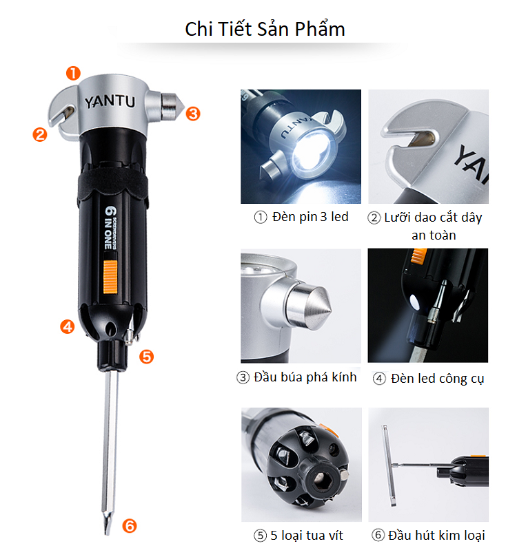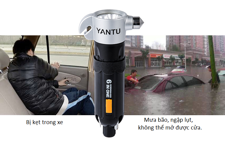 Búa thoát hiểm trên ô tô 6in1 YANTU Z39 thiết kế đầu búa dùng để phá vỡ kính, bộ búa thoát hiểm 6 trong 1. Còn có lưỡi dao cắt dây đai an toàn là công cụ không thể thiếu trên các loại ô tô, dùng trong trường hợp cần thoát nạn khẩn cấp, phá kính, cắt dây đai an toàn.