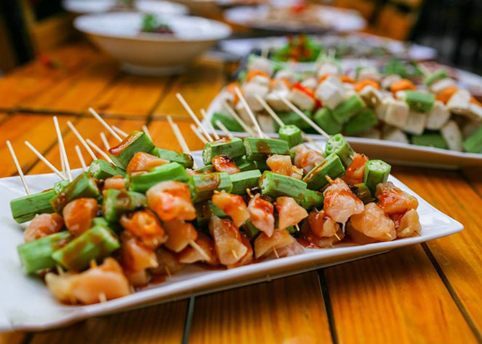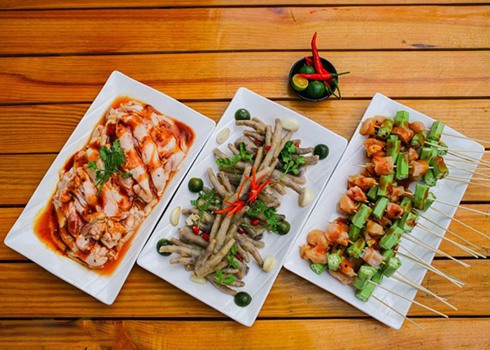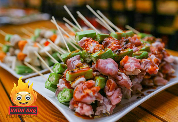 Mở màn đại tiệc buffet, menu nướng của HAHA BBQ sẽ khởi đầu với những món được làm từ nguyên liệu gà sạch, giàu protein, chất béo, vitamin A, B1, B2, C, E, axit, canxi, photpho, sắt có trong các món: Ức gà xiên que rau củ, chân gà ướp sốt BBQ, mề ướp sốt BBQ, má đùi ướp sốt BBQ.