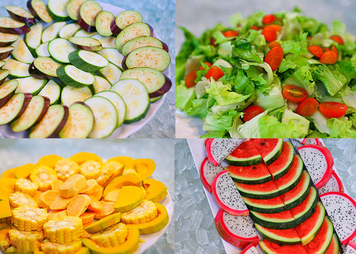 Nhằm giúp cho cuộc vui ẩm thực của bạn không bị gián đoạn, HAHA BBQ còn cung cấp các loại rau củ quả tươi, xanh, sạch để bạn nướng kèm với các món thịt như: Cà tím nướng, khoai lang nướng, bí ngòi nướng, bắp mỹ nướng, đậu bắp nướng, bí đỏ nướng. Cũng không thể thiếu những món gỏi hay salad giúp mang lại cảm giác tươi mát, cân bằng vị giác giữa bữa ăn đầy thịt thà như: gỏi đu đủ, gỏi xoài, rau salad trộn sốt mayonaise, rau salad carol trộn dầu giấm, cà chua bi, gỏi rau muống…