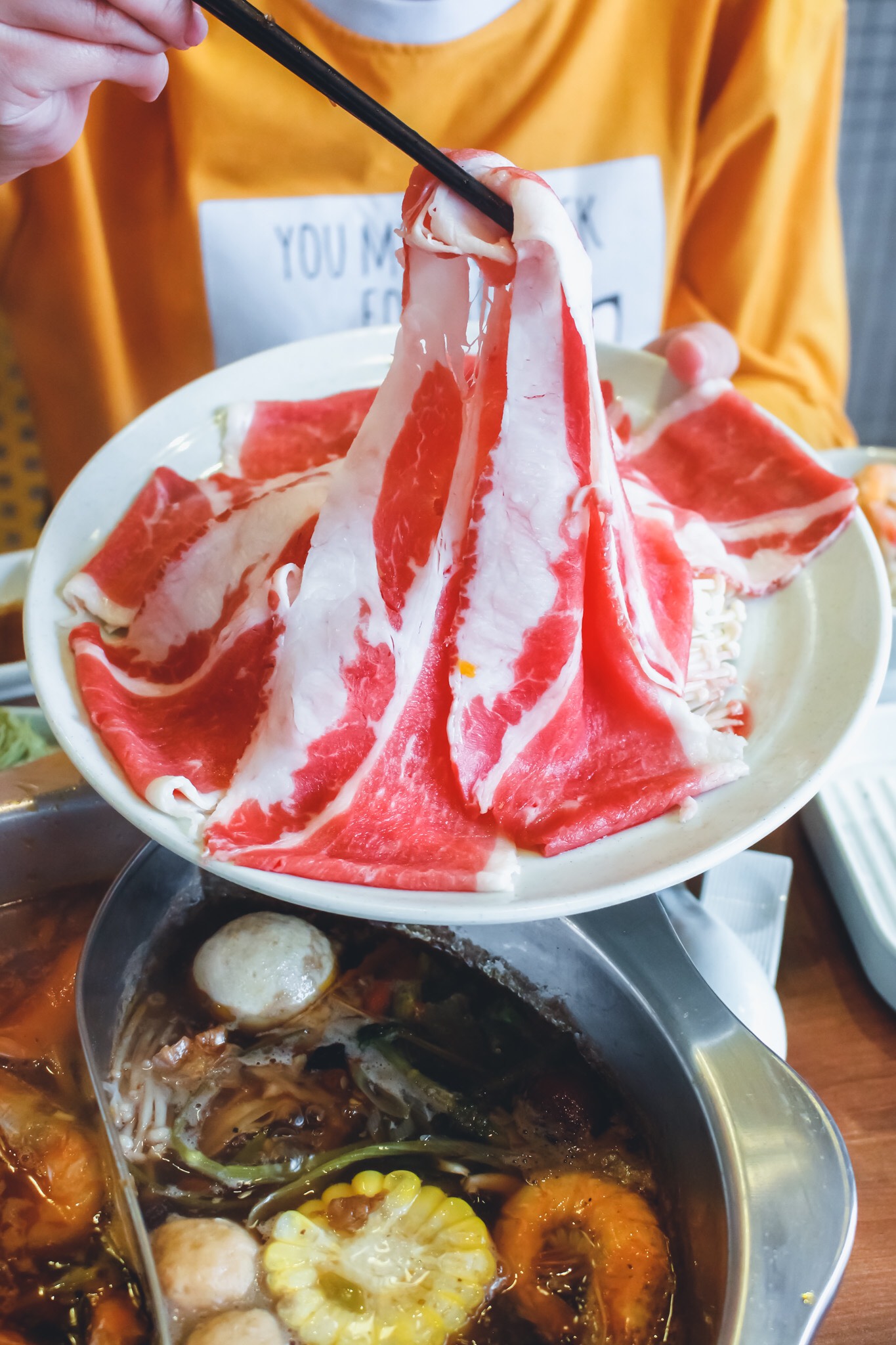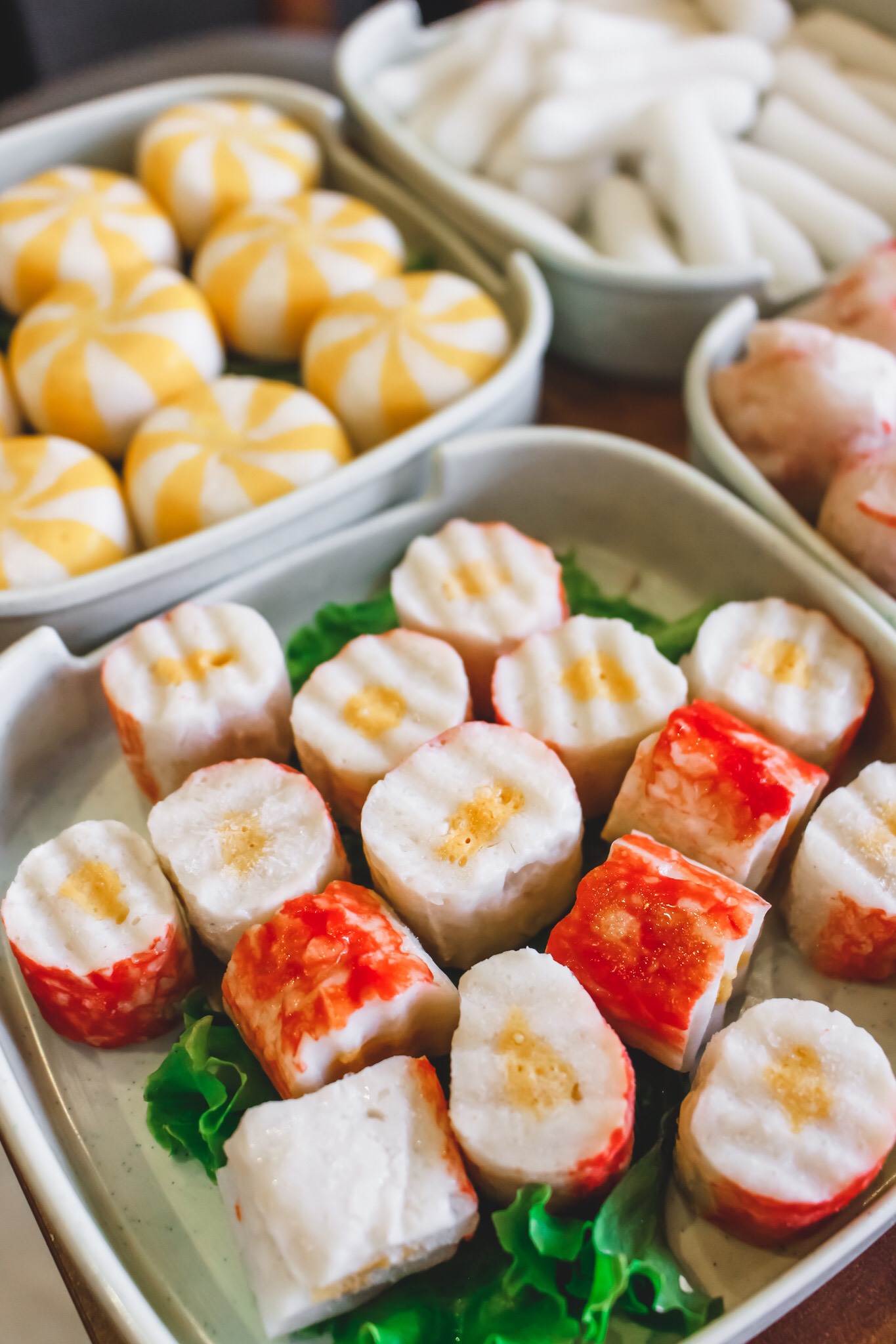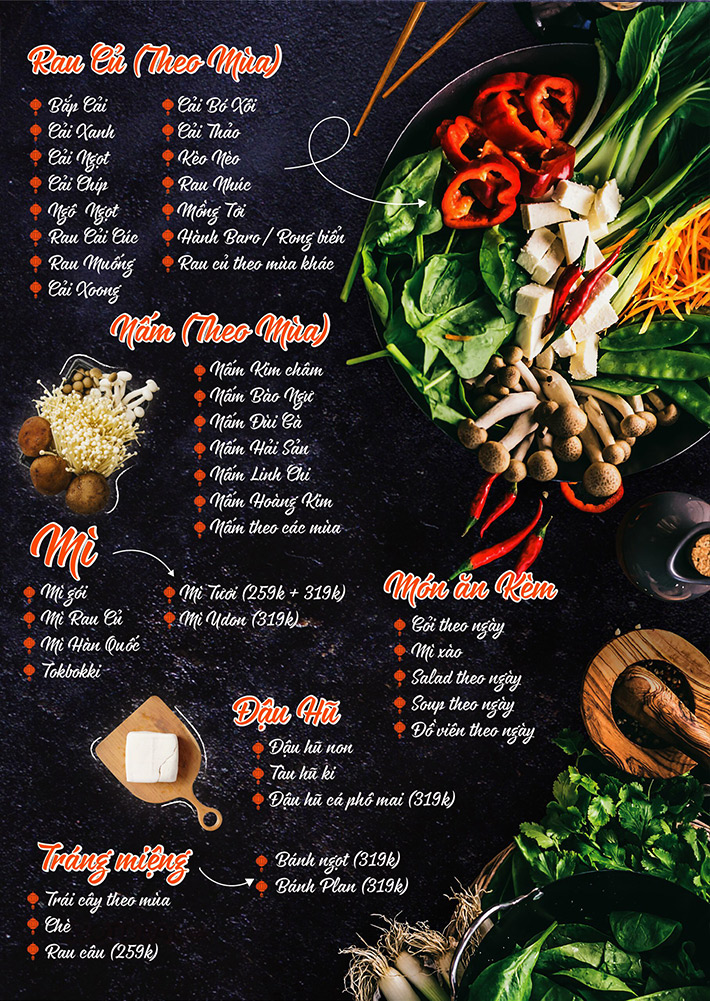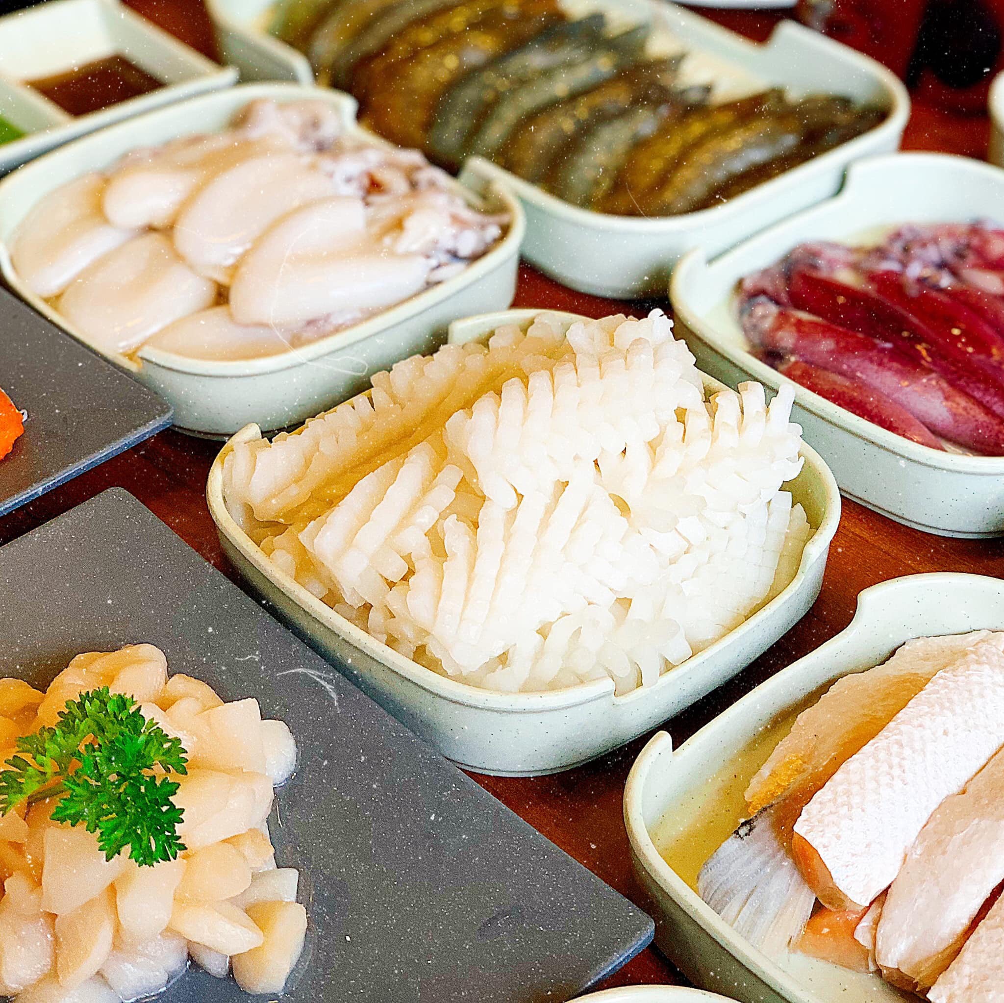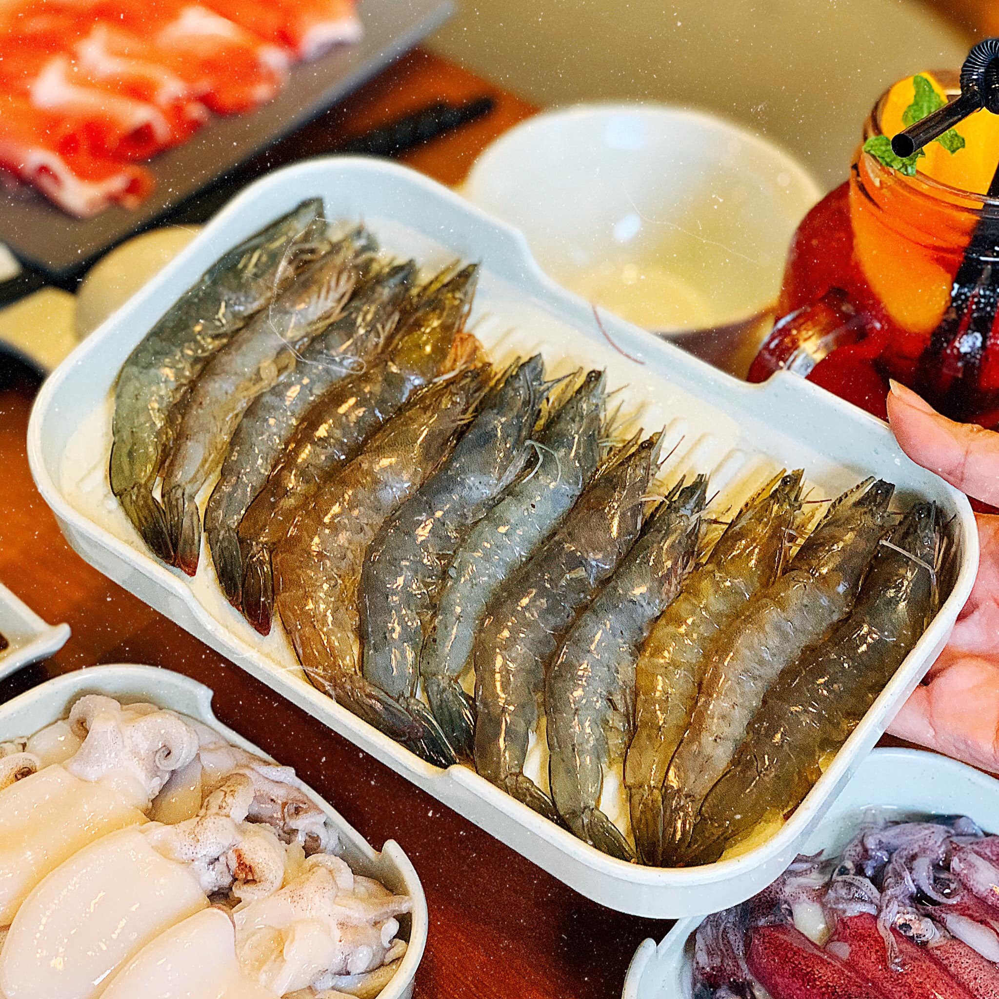 Tiếp theo, bạn sẽ tiến hành lựa chọn các món nhúng để ăn kèm với lẩu. Đầu tiên không thể thiếu là các loại thịt bò thượng hạng nhập khẩu như: ba chỉ bò Mỹ, bắp bò Úc, nạc cổ bò Mỹ, thăn cổ bò Úc, gầu bò Úc… Ngoài ra, nạc vai heo ba chỉ heo hay đùi gà rút xương cũng làm cho nồi lẩu của bạn thêm phong phú. Món lẩu sẽ càng thêm hấp dẫn, thăng hoa với những món hải sản tươi rói, gồm có: bạch tuộc, mực nang, mực trứng, mực ống, tôm thẻ… và các loại cá viên, cua viên… Thực đơn còn có nhiều loại rau xanh, nấm, mỳ tươi, mỳ udon, tokbokki để bạn thưởng thức chung với lẩu.