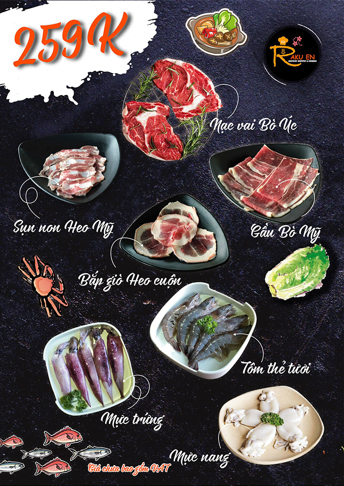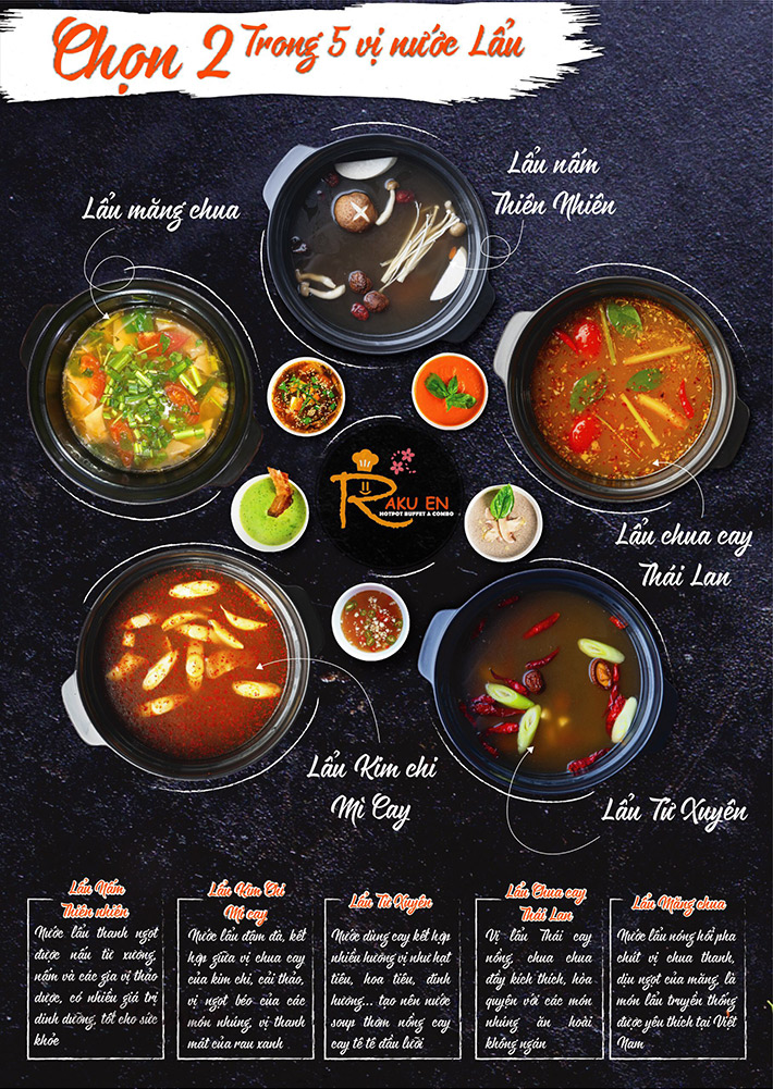 Buffet Rakuen Hotpot sẽ hoàn toàn chinh phục các thực khách với thực đơn đa dạng các món nhúng hải sản, các loại thịt thượng hạng và dimsum khai vị. Bước đầu tiên để bắt đầu một bữa tiệc buffet hoành tráng tại Rakuen Hotpot, bạn sẽ lựa chọn từ 1 đến 2 trong số 5 vị lẩu sau: Lẩu Tứ Xuyên Hongkong/ Lẩu nấm Kinoko Rakuen/ Lẩu kim chi mỳ cay/ Lẩu thái chua cay/ Lẩu chua thuần Việt. Với nhiều sự lựa chọn nước lẩu phong phú, Rakuen có thể đáp ứng mọi khẩu vị và ý thích của các thực khách
