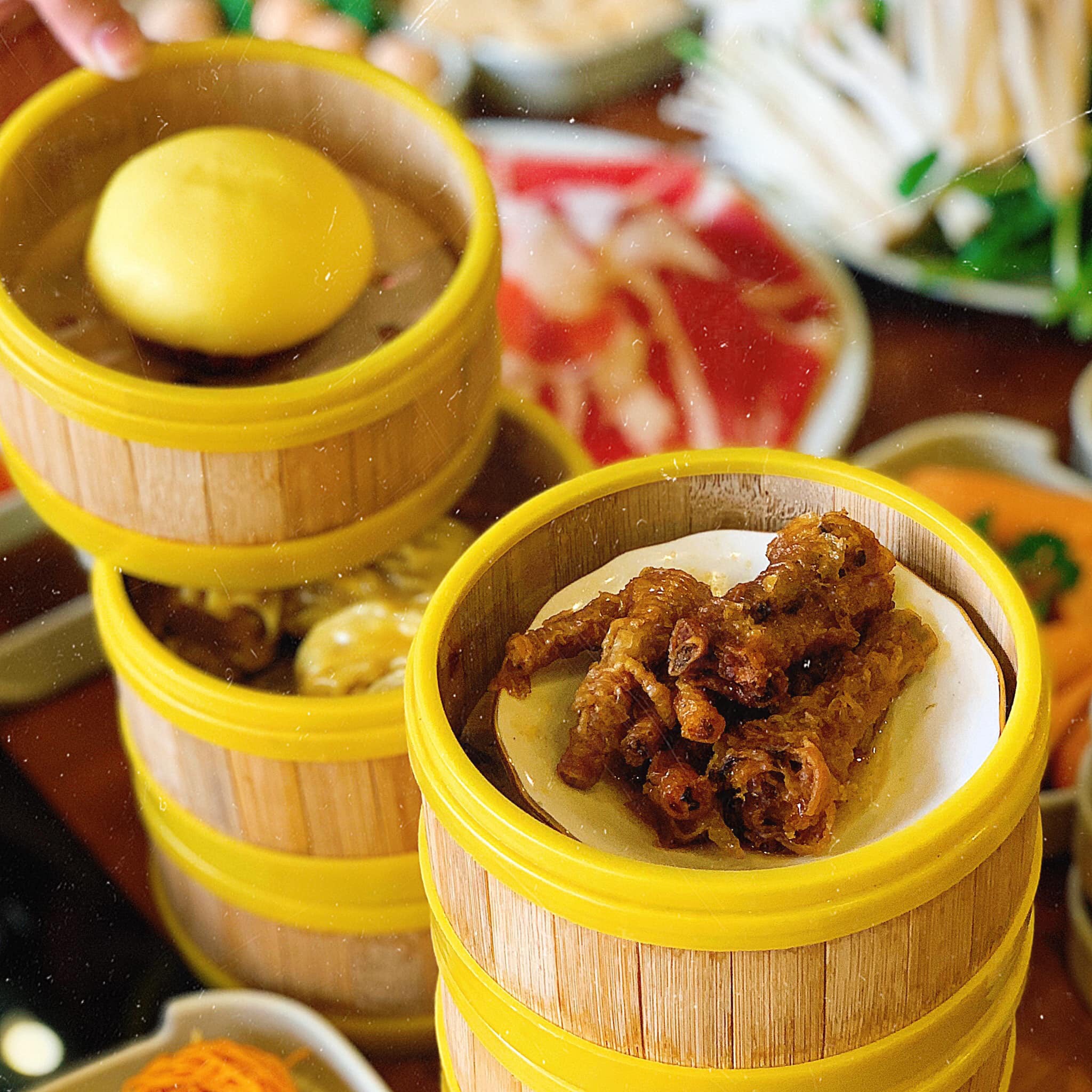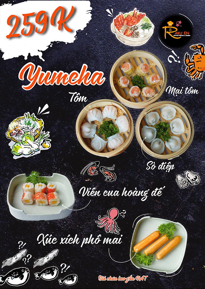 Bên cạnh lẩu, khi đến Rakuen Hotpot, bạn còn được thưởng thức các món dimsum hấp dẫn như: xíu mại, há cảo tôm, yum cha sò điệp, yumcha tôm, bánh bao kim sa, nhím biển trứng cá… Đặc biệt, dimsum tại Rakuen được phục vụ trong các xửng hấp bằng tre đúng kiểu truyền thống, giúp bạn thưởng thức món ăn ngon miệng hơn.