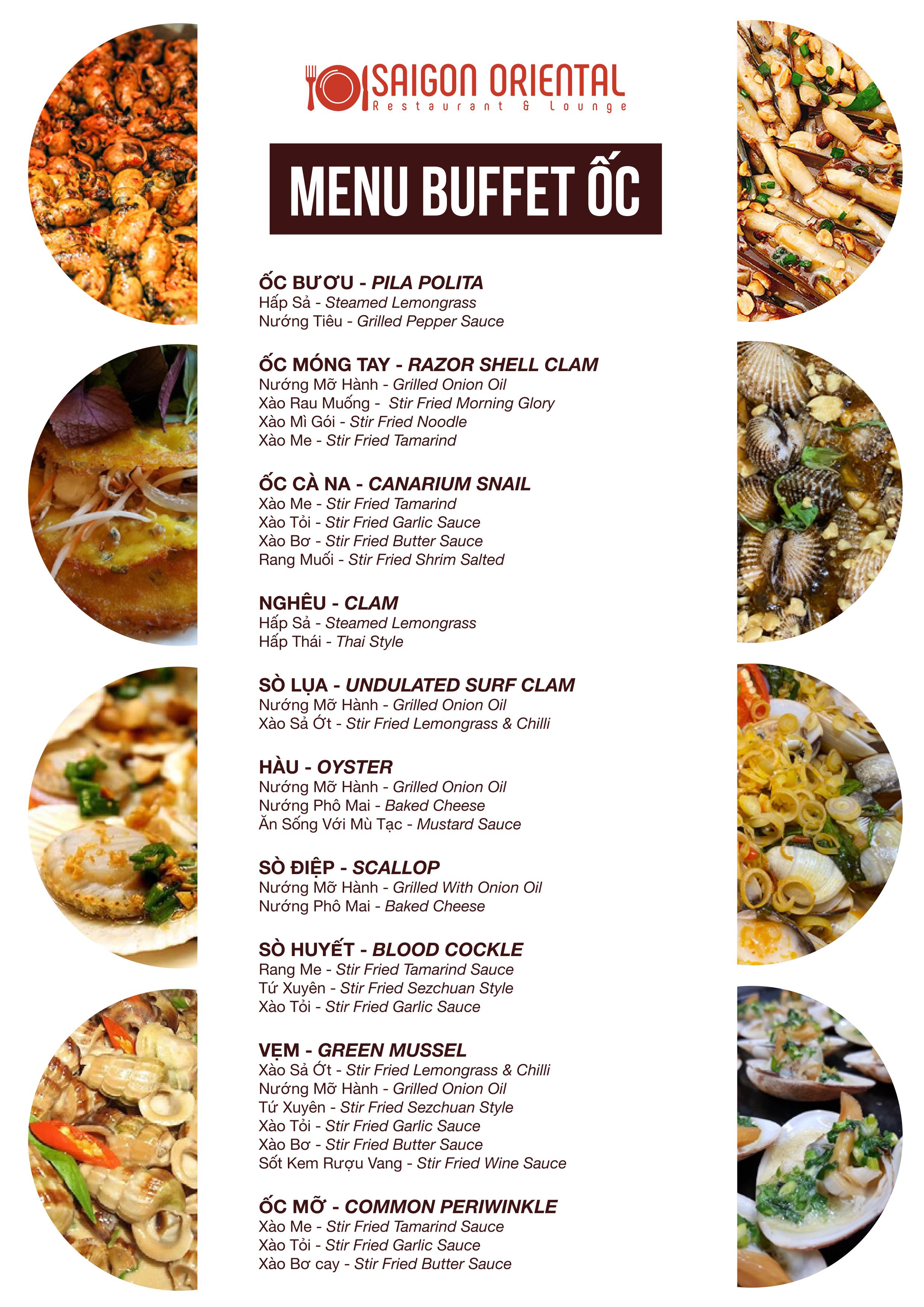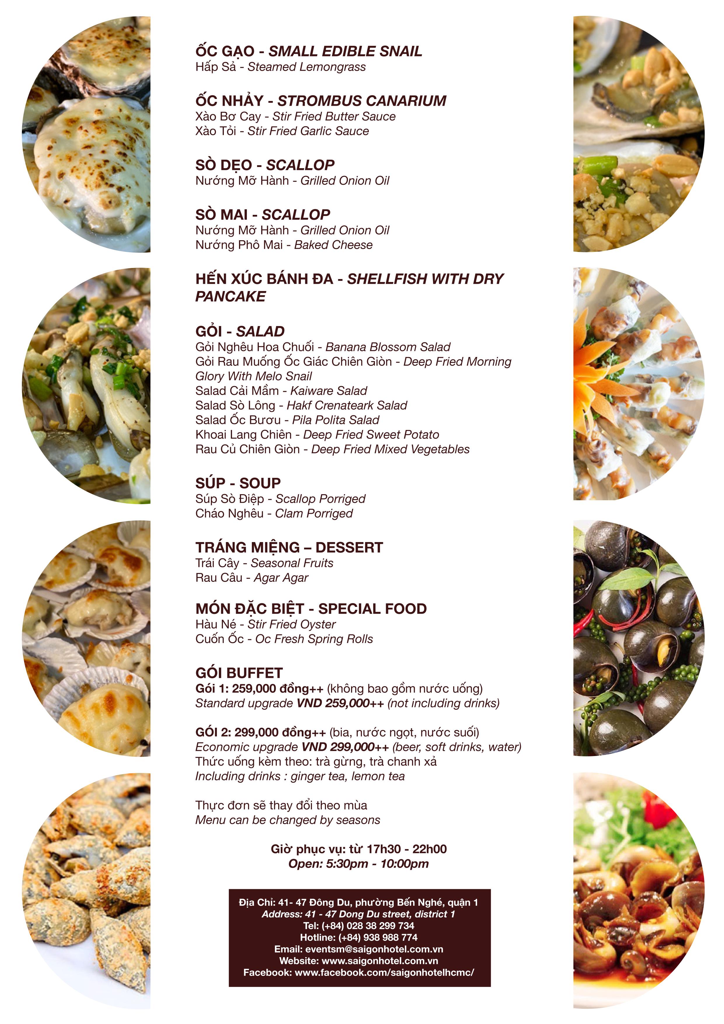 Nhà hàng tại Khách sạn Sài Gòn phục vụ thực khách đa dạng các món ăn đặc trưng của và nhiều món Á - Âu đặc sắc. Thực đơn buffet giới thiệu đến khách hàng rất nhiều món ốc được chế biến tài tình như ốc bươu nướng tiêu, ốc móng tay mỡ hành, ốc móng tay xào me, ốc mỡ xào tỏi, ốc nhảy nướng mọi, ốc cà na xào bơ, ốc cà na rang muối, nghêu hấp Thái, sò lụa mỡ hành, hàu nướng phô mai, sò điệp nướng mỡ hành, sò huyết Tứ Xuyên, vẹm xào sả ớt, vẹm sốt rượu vang,… Vẫn là những món ốc quen thuộc nhưng mỗi món ăn tại nhà hàng lại được biến tấu đặc sắc, cho hương vị đặc biệt thơm ngon, “càng ăn càng ghiền”.