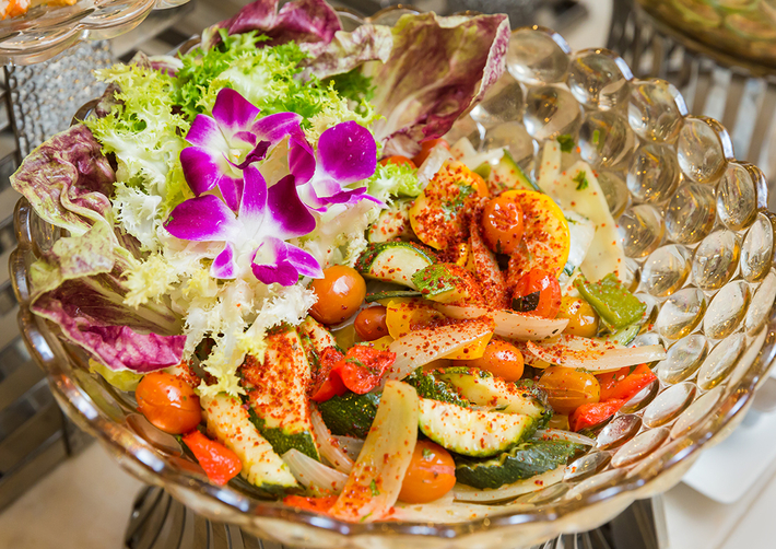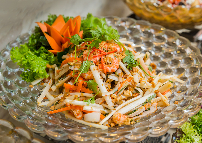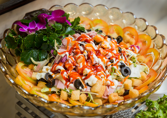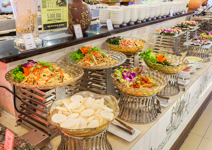 Khởi đầu bữa ăn từ quầy khai vị, thực khách có thể chọn lựa các món gỏi hoặc súp như: Gỏi rau muống trộn bò, gỏi tai heo ngũ sắc, salad mướp tây, salad thập cẩm, salad tôm trái cây, Sự tươi ngon, màu sắc sống động cùng hương vị hòa trộn tinh tế của mỗi món ăn sẽ cho bạn những ấn tượng thật khó quên.