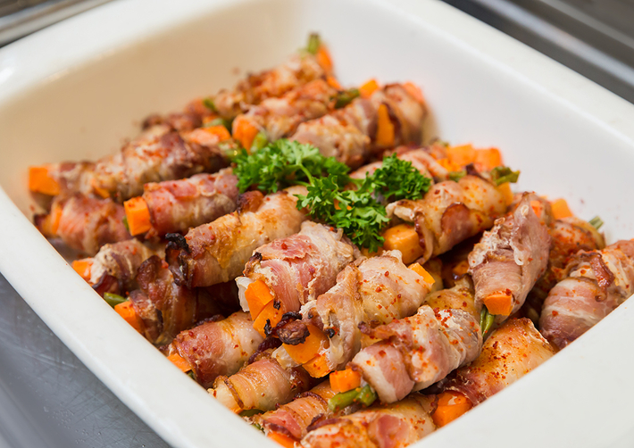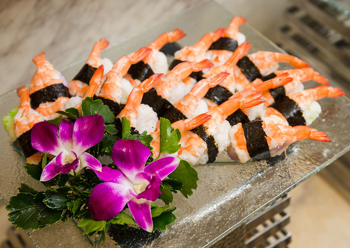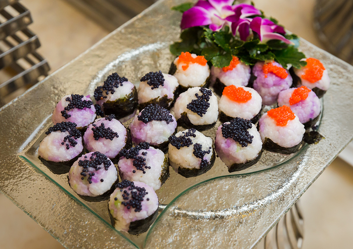 Bạn cũng có thể thay đổi khẩu vị với các món sushi đầy hấp dẫn. Sự tươi ngon của nguyên liệu cùng hương vị đúng chất Nhật sẽ mang đến cho bạn những ấn tượng khó quên. Hoặc khởi đàu bằng sandwich cuộn thịt xông khói và phô mai hay thử phô mai cùng nho tươi sẽ đánh thức vị giác của bạn để sẵn sàng thưởng thức các món tiếp theo.
