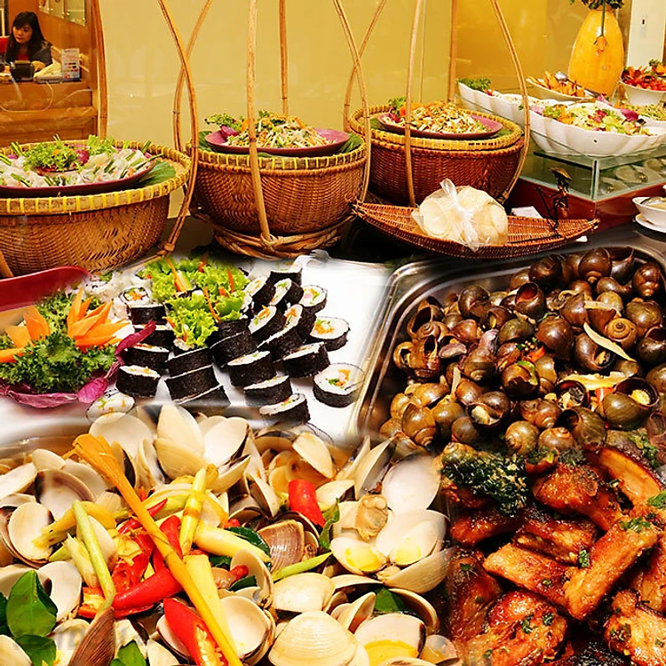 Khởi đầu bữa ăn từ quầy khai vị, thực khách có thể chọn lựa các món gỏi chua ngọt hài hòa như: Gỏi gà cây chuối, gỏi củ hủ dừa tôm thịt, salad mướp tây xào, rau càng cua trộn trứng, salad thập cẩm, salad bắp cải trộn nho, , Sự tươi ngon, màu sắc sống động cùng hương vị hòa trộn tinh tế của mỗi món ăn sẽ cho bạn những ấn tượng thật khó quên.