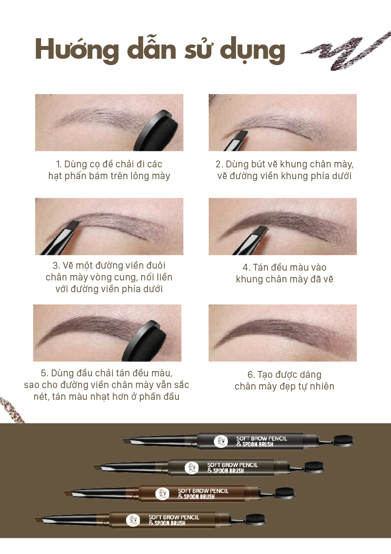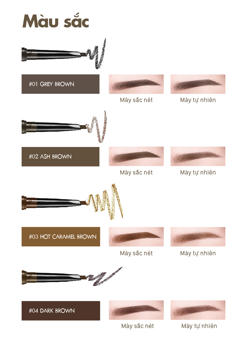 "Sáng tạo nên dáng chân mày đẹp với bút kẻ mày dạng vặn, đi kèm đầu chì sáp mềm mại không gây tổn thương da, dễ dàng kẻ được các kiểu lông mày tự nhiên, có thể điều chỉnh độ dày và đậm nhạt của lông mày theo ý thích. Màu lên đậm, lâu trôi, ngoài ra còn có đầu cọ bàn chải đặc biệt với lông cọ dày giúp chải các sợi lông mày vào dáng và màu được tán đều tự nhiên hơn. Có tất cả 4 tông màu cho bạn chọn.