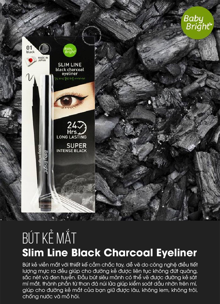- Bút Kẻ Mắt Baby Bright Slim Line Black Charcoal Eye Liner (1g) với thiết kế cầm chắc tay, dễ vẽ do công nghệ điều tiết lượng mực ra đều giúp cho đường kẻ được liên tục không đứt quãng, sắc nét và đen tuyền.