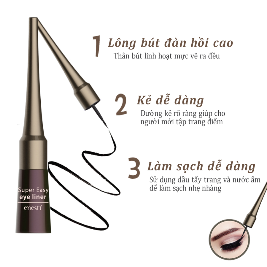 • Bút Kẻ Mắt Chống Nước Enesti với thiết kế đầu cọ mềm, mảnh để tạo nét vẽ thanh thoát và dễ định hình đường kẻ. Chất mực bám lâu, không trôi không lem trong nước.