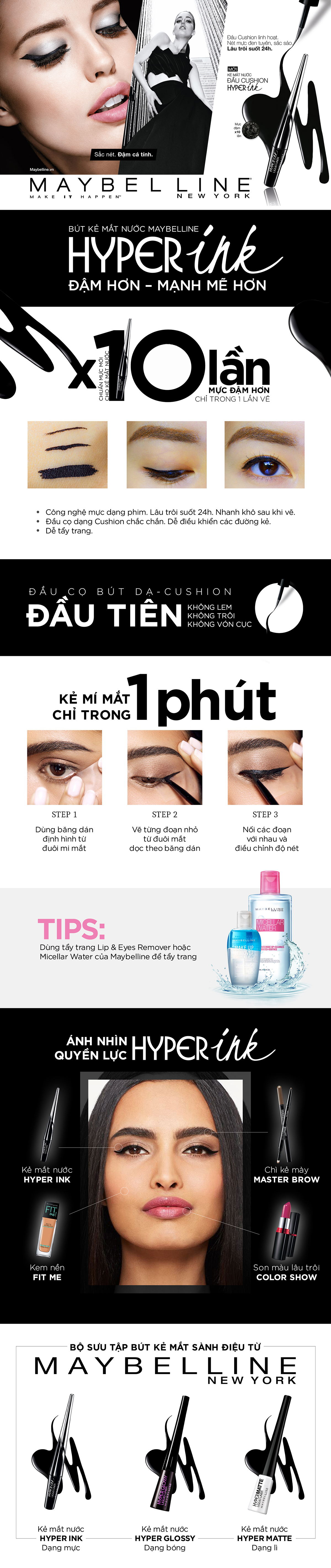 - Kẻ mắt nước Maybelline Hyper Ink không lem, không trôi suốt 24 giờ nhưng lại hoàn toàn dễ tẩy trang.