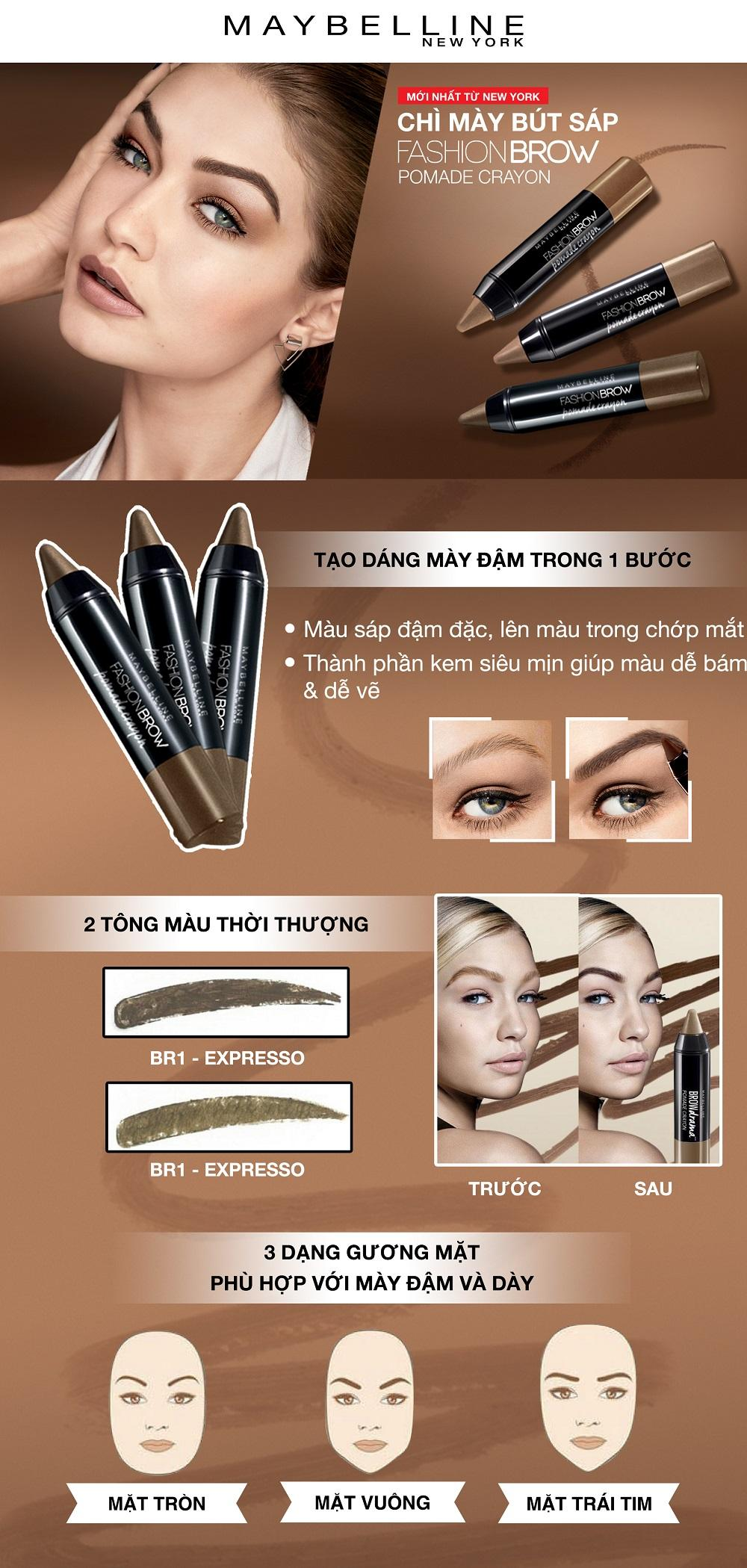 - Bút Kẻ Mày Sáp Maybelline New York Pomade Crayon với đầu bút dạng sáp mềm linh hoạt giúp tạo dáng chân mày chỉ trong một bước. Đầu bút dễ điều khiển cho đường kẻ chuẩn xác. Màu sáp ấn tượng giúp bạn sở hữu hàng lông mày sắc sảo.