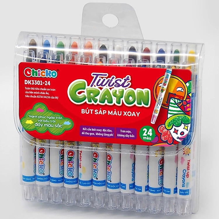 • Bút Sáp Màu Xoay Chicko - 24 Màu (Túi Nhựa Pvc) Bút sáp màu xoay được làm từ những thành phần không độc hại, giúp bé an toàn khi sử dụng, kết cấu bút xoay độc đáo, dễ thu gọn, trơn mịn, không dây bẩn, tiết kiệm khi sử dụng.