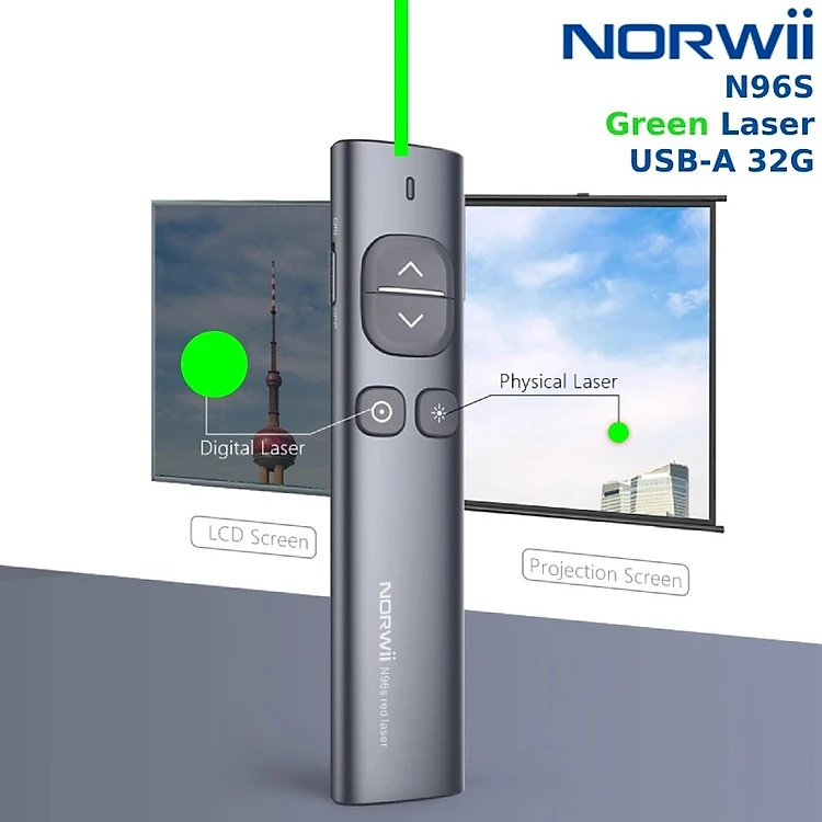 Bút trình chiếu kĩ thuật số LASER xanh NORWii N96S dùng cho màn hình LED/TV và màn chiếu. Tích hợp bộ nhớ 32GB. HÀNG CHÍNH HÃNG CÓ BẢO HÀNH