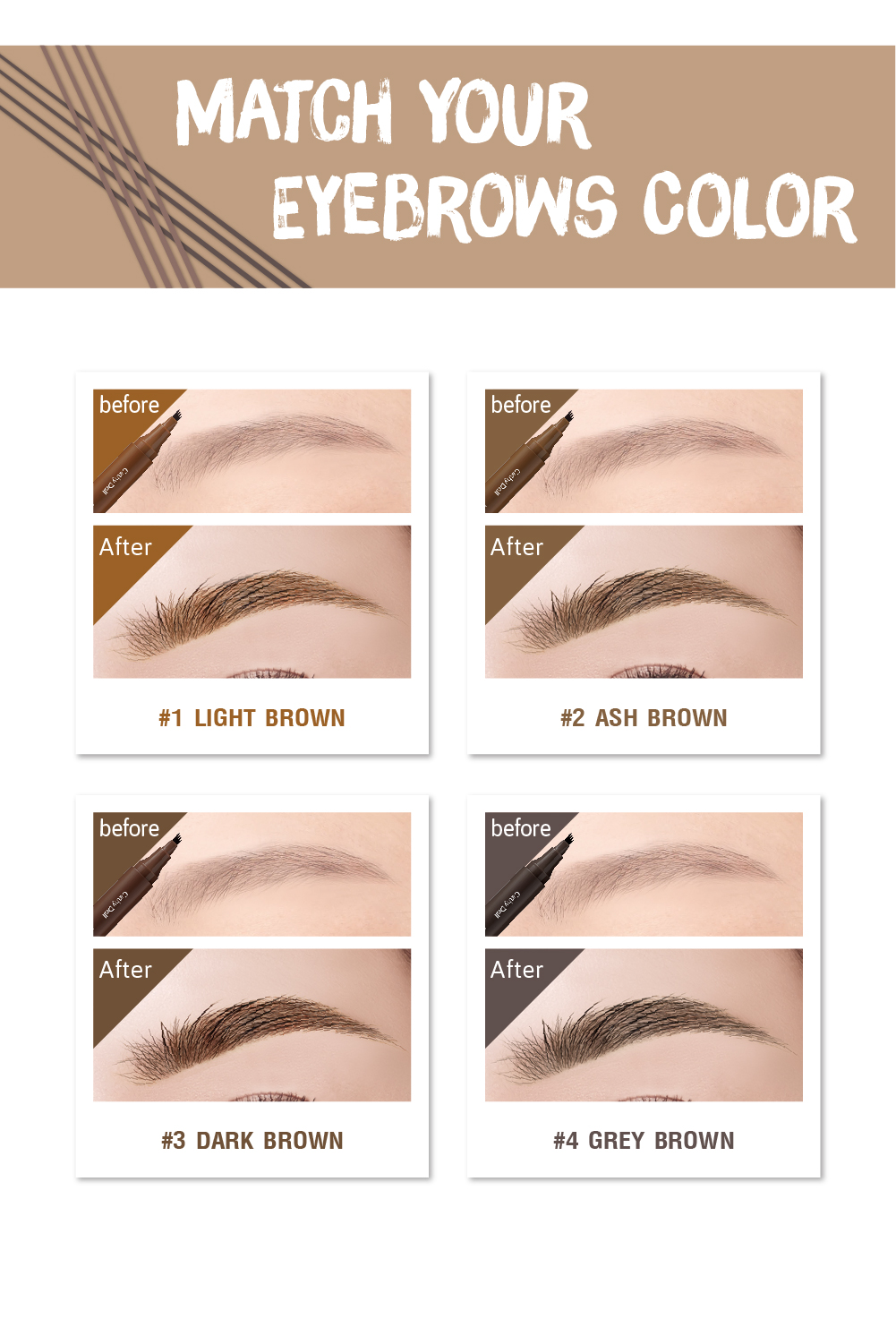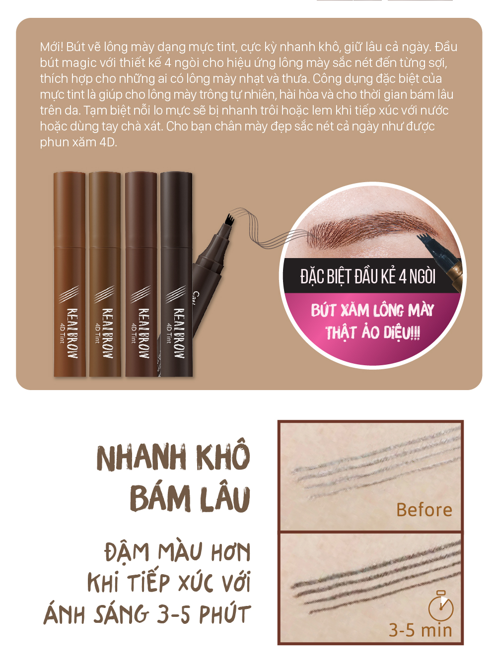Đầu bút magic với thiết kế 4 ngòi cho hiệu ứng lông mày sắc nét từng sợi, thích hợp cho những ai có lông mày nhạt và thưa. Công dụng đặc biệt của mực tint là giúp cho lông mày trông tự nhiên, hài hòa và cho thời gian bám lâu trên da.