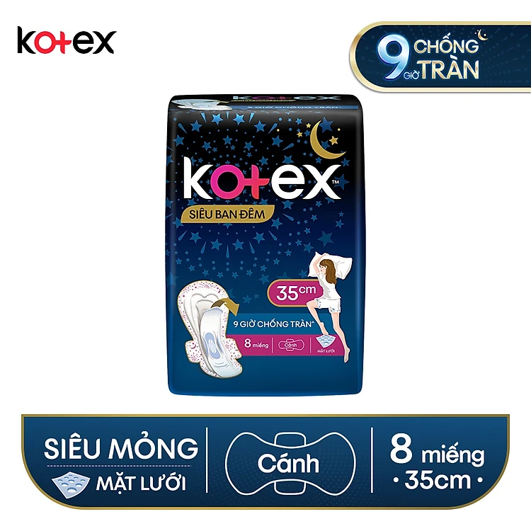 Băng vệ sinh siêu ban đêm Kotex được thiết kế đặc bịệt với cấu trúc ngăn hai bên, ngăn sau và ngăn đa chiều cùng chiều dài 35cm, giúp mang đến 9 giờ chống tràn thoải mái và hiệu quả suốt những đêm nhiều. Sản phẩm không gây kích ứng, an toàn cho mọi loại da.