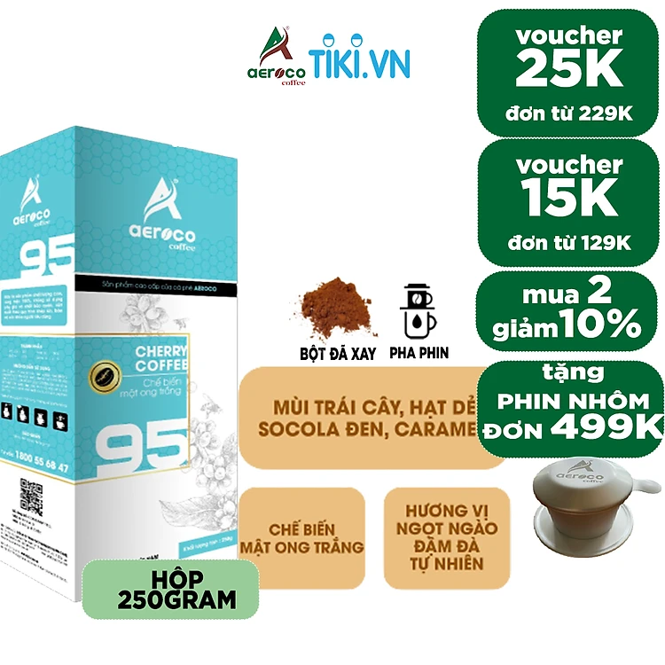 Cà phê bột pha phin AEROCO 95 nguyên chất 100% rang mộc hậu vị ngọt thơm quyến rũ, hộp 250g