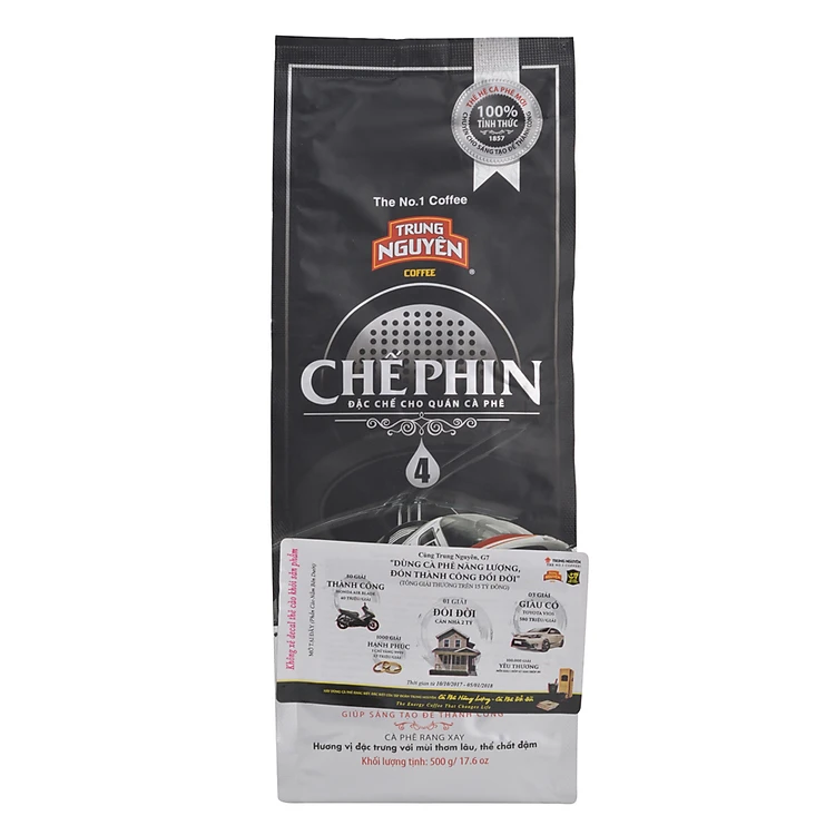 - Cà Phê Chế Phin 4 Trung Nguyên (500g) được chế biến từ hạt Arabica, Robusta, Catimor và Excelsa ngon nhất thế giới nên cà phê của Trung Nguyên có mùi thơm bền, đầm và nước pha màu nâu đậm, mang lại những tách cà phê tuyệt hảo và những ý tưởng sáng tạo đột phá để thay đổi đời người.