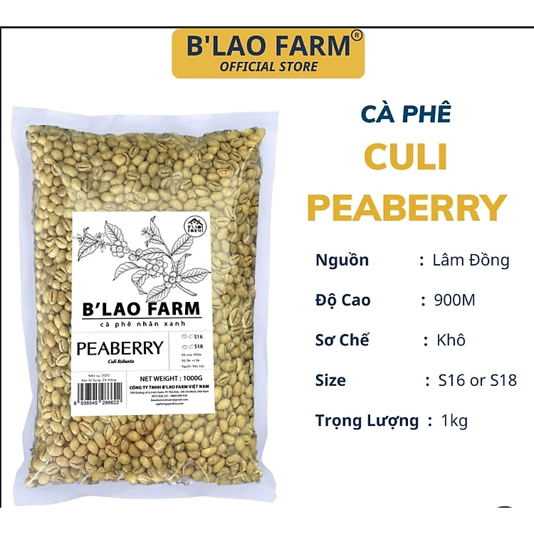 Cà phê nhân xanh CULI loại 1 B'Lao Farm peaberry cafe chưa rang sàng 18 đã được chà bóng băn màu sơ chế khô túi 1kg CX18
