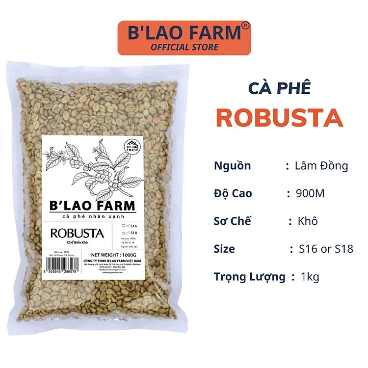 Cà phê nhân xanh ROBUSTA S18 B'Lao Farm cafe chưa rang sàng 18 đã được chà bóng băn màu sơ chế khô túi 1kg RX18