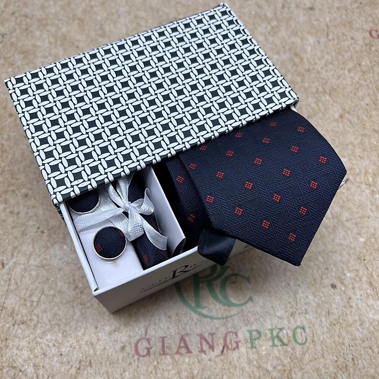 Hộp quà tặng gồm 1 cà vạt nam 8cm kích cỡ chuẩn 8cmx150 k. 1 hộp đựng cà vạt , 01 Khăn túi áo véc 20x20 cm , 1 cặp khuy áo măng sét cũng tông màu . Là khách hàng của Giangpkc, chúng tôi cam kết bạn được :