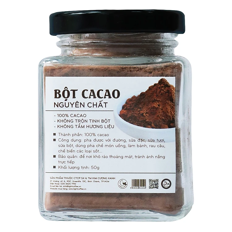 - Cacao Nguyên Chất Light Cacao C50 (Hũ 50g) được làm từ ca cao nguyên chất 100%, không pha trộn tạp chất, không tẩm ướp bất cứ hương liệu nào khác.