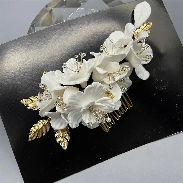 Cài tóc cô dâu hoa đất sét trắng có sẵn xược cài mã 002 - 15cm