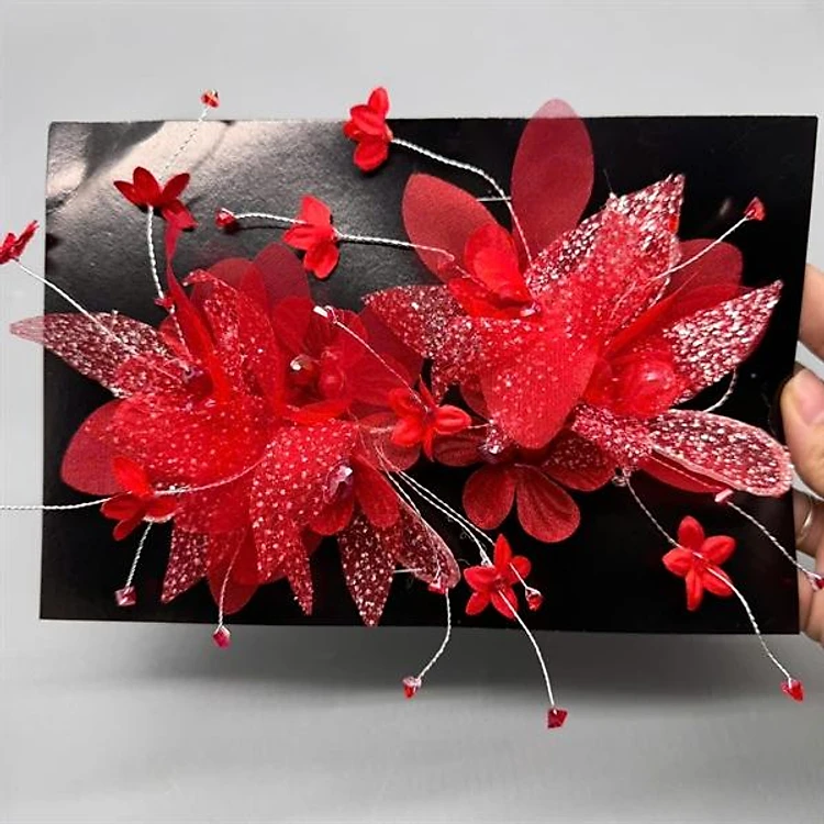 Cài tóc cô dâu hoa đỏ lưới nhũ đính hoa mẫu mới t12/2024