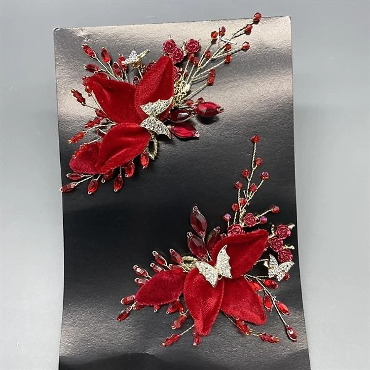 Cài tóc cô dâu hoa nhung đỏ đính bướm vàng