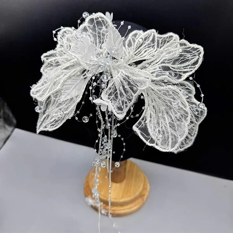 Cài tóc cô dâu hoa vải gân đính lá trắng dây pha lê đính hoa rơi