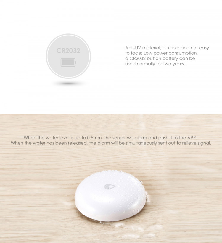 Cảm biến ngập nước Aqara có đường kính 5cm và dày 1.5cm. Sản phẩm này không cần bất kỳ cài đặt nào, nó có thể được đặt bất cứ nơi nào theo nhu cầu như trong phòng tắm, phòng ngủ, nhà kho, phòng và các vị trí khác. Ngoài ra, cảm biến ngập nước Aqara có mức tiêu hao năng lượng rất thấp với pin có thể được sử dụng trong 2 năm, và nó cũng có thể được thay thế.