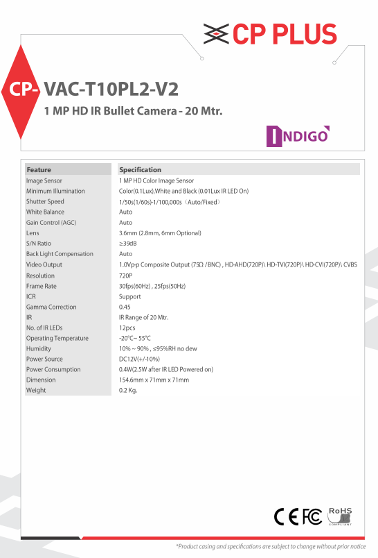| Video Output | 1.0Vp-p Composite Output (75O / BNC) , HD-AHD(720P)\ HD-TVI(720P)\ HD-CVI(720P)\ CVBS |