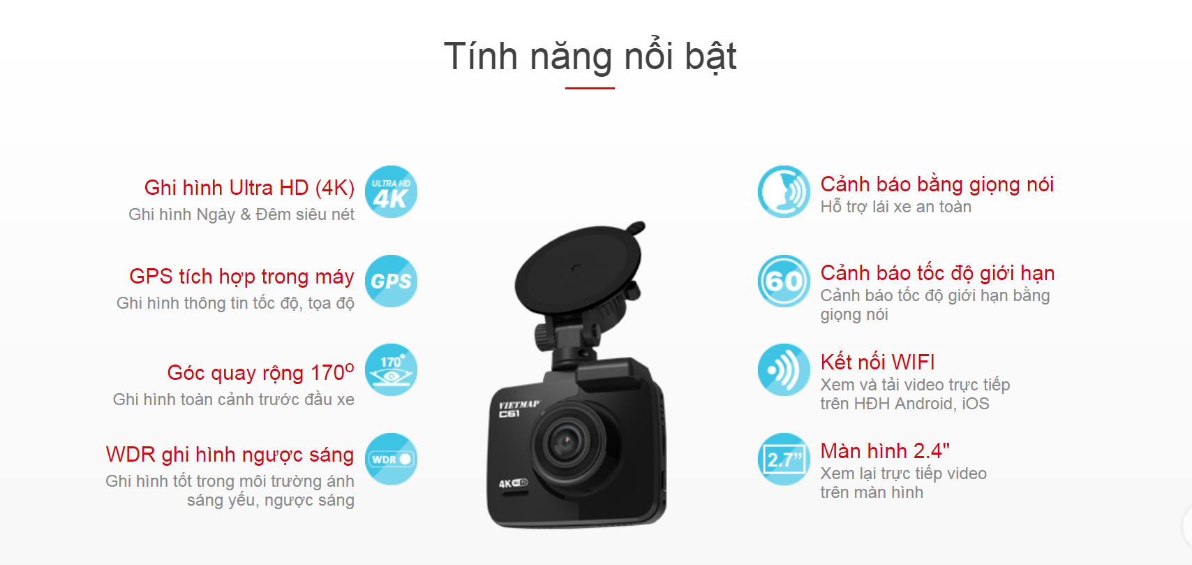 VietMap C61 được trang bị chip xử lý hình ảnh cao cấp giúp ghi hình siêu sắc nét với độ phân giải cao Ultra HD 4K cùng với thông tin tốc độ, tọa độ.